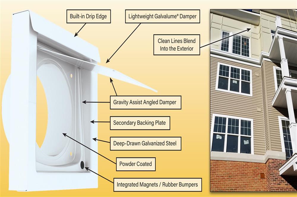 The low profile DryerWallVent® is a superior, safer choice for venting dryer exhaust to the exterior. Engineered for a quick, perfect fit for both vent replacement and new construction, this stylish and durable enclosure meets or exceeds all code requirements for safe dryer venting. Heavy gauge Galvalume® steel body with powder coating ensures a long duty life. Clean lines make a nice aesthetic contribution to every home.