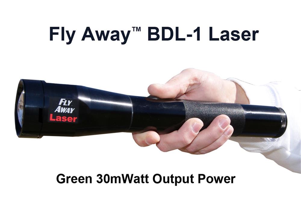 The Fly Away BDL-1 Bird laser is a 30mWatt output power, class 3B, green bird laser that effectivley disperses birds from up to 1 mile away.