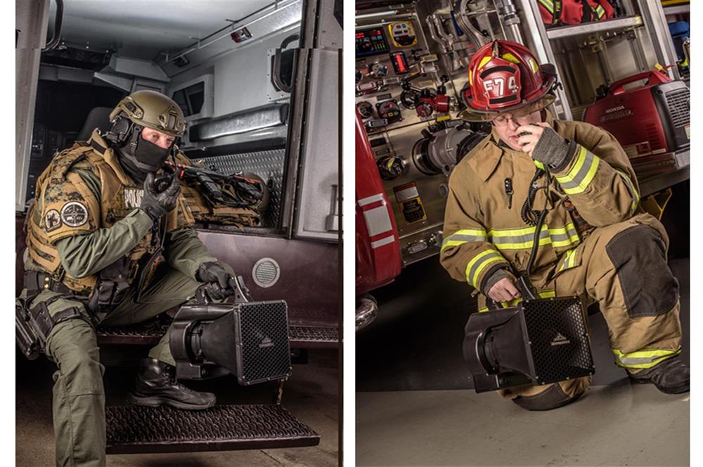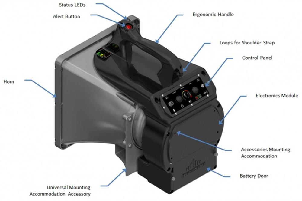 NEW HS-10, next generation of the HS-Micro, is a self contained, portable acoustic hailing device that comes in two models. Weighing only 15 lbs, the HS-10R packs a peak acoustic output of 144dB for a communication range of 750+m. Easily accessible, the built-in high frequency alert tone is readily activated with the push of a button.