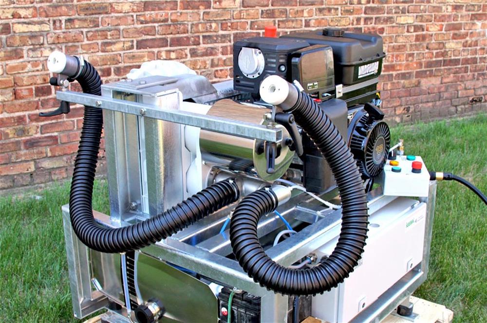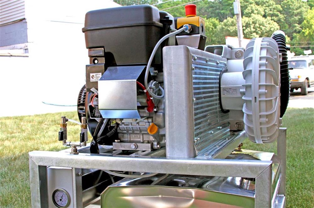 A self-contained, gas motor powered, frame mounted aerosol generator fogs large open areas quickly, efficiently and quietly. Applies all types of solutions through 2 movable spray nozzles. Uses 13HP Briggs and Stratton Vanguard engines for power. Remote control for in-cab fogging.