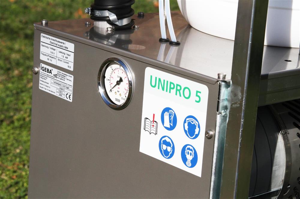 UNIPRO5 is equipped with a 110 V - A.C. - Asynchronous motor. The solution System is acid resistant and therefore also applicable for acid based solutions. The motor is encapsulated and maintenance-free, as is the blower.The machine can be used nearly everywhere and through the self-running operation and possibilities of time control, no supervision is required which contributes to operator safety and protects from personal hazards.