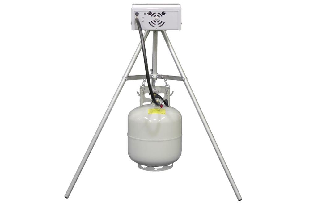 360º Rotating Tripod for the Model 14-1 propane sound cannon provides coverage over a larger area by rotating the cannon ~30° every time it fires. Just like our standard tripod, it's constructed from durable, corrosion resistant metals, is collapsible, and includes 3 hooks to support a standard 20lb propane tank (not included).