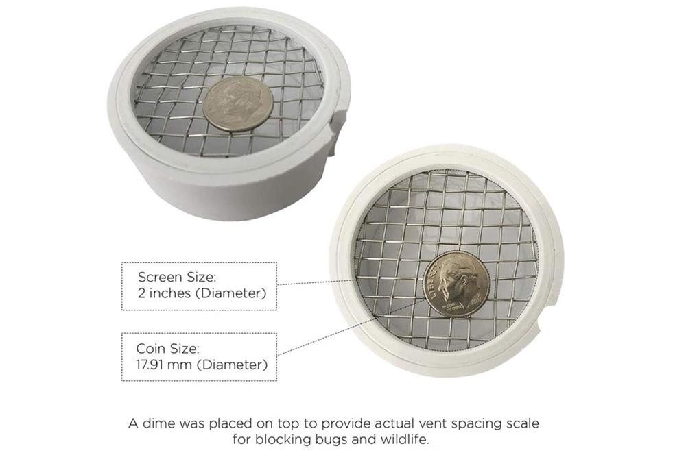 PVC Termination Vent Screens for protecting exhaust or vent terminations from wildlife, leaves, and debris.