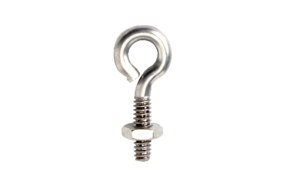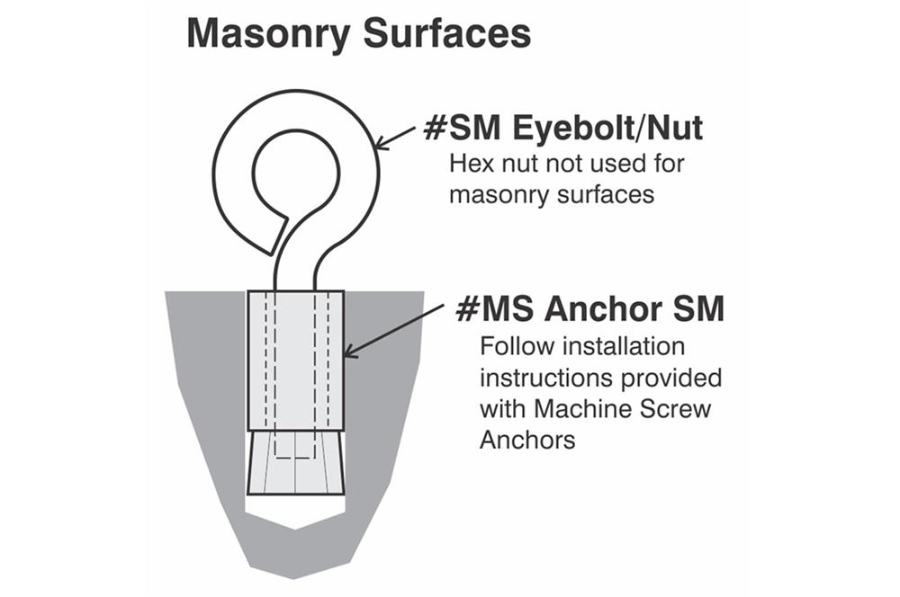 Large Eyebolt w/Nut HD stainless steel eyebolt, 9/16” I.D., 1” stem, 1/4-20 thread with stainless hex-nut. For steel or masonry surfaces – masonry anchors sold separately.