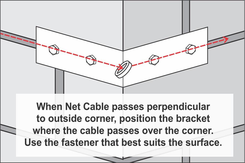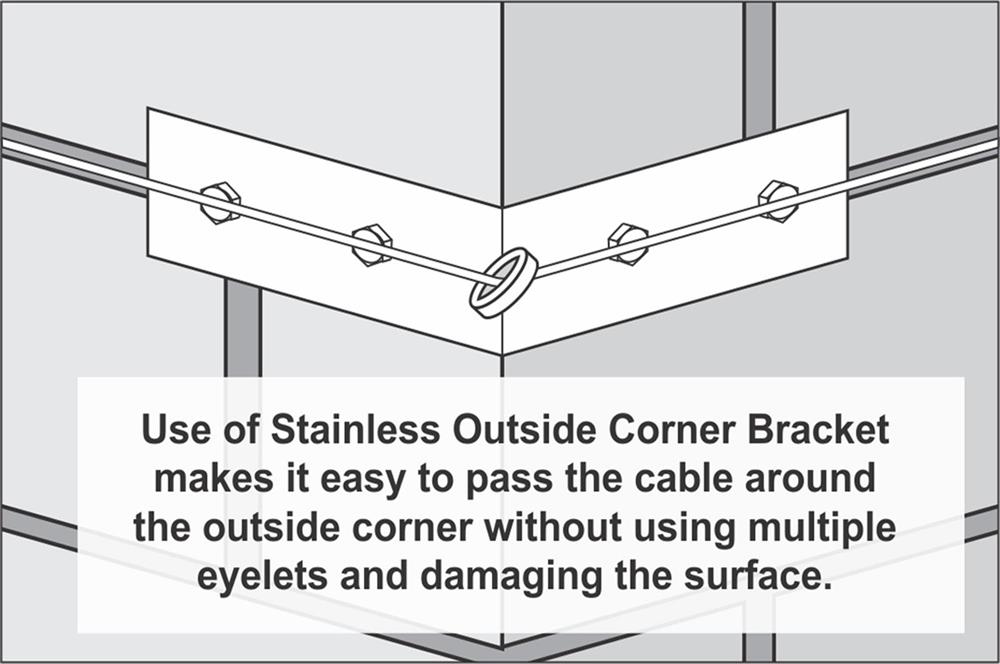 Stainless outside corner brackets are used to simplify the process of running the Net Cable around or along an outside corner. Without the bracket, running Net Cable around or along the corner used multiple sets of hardware on each side of corner – often running the risk of damaging the surface.