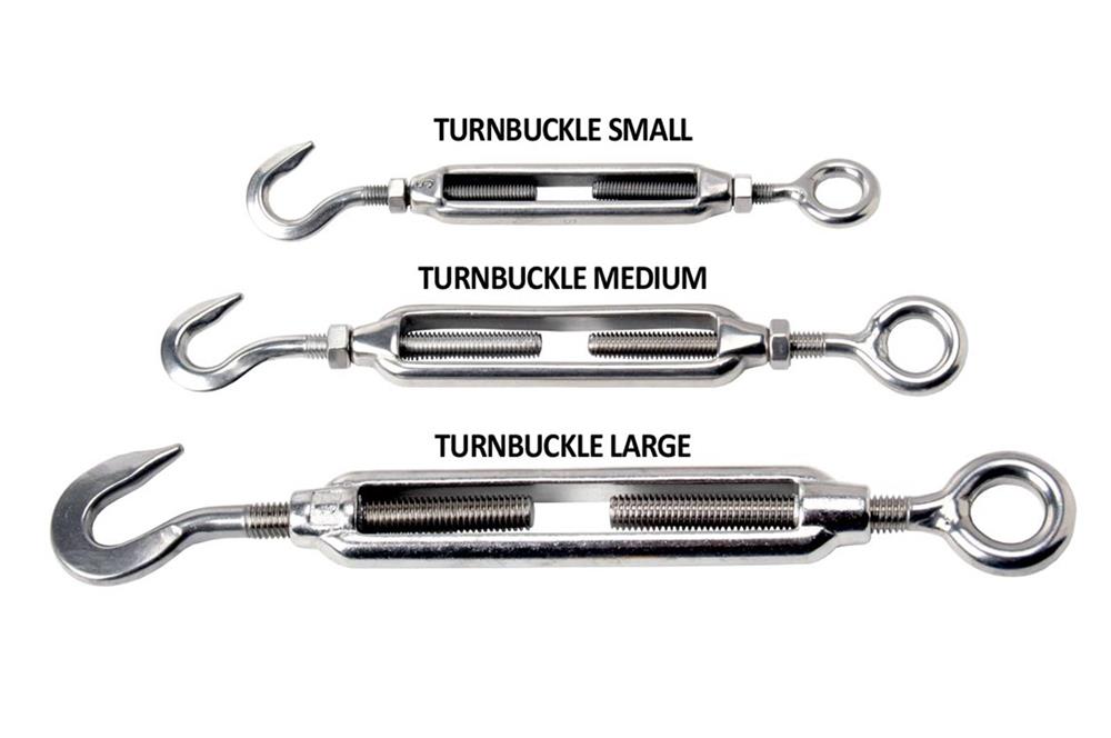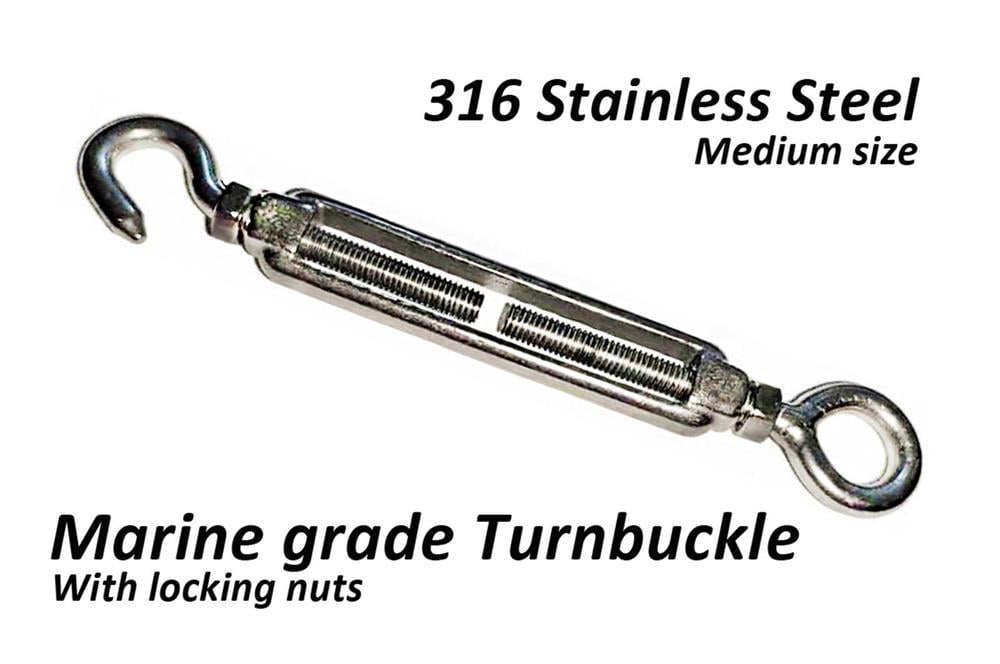 • Stainless Steel hook and eye marine grade turnbuckles are available in Medium size made from 316 SS.
